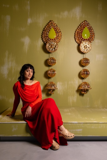 Jewellery and heirlooms are key within Rani Rudhar’s practice as repositories of inherited memory and tangible links to cultural homelands and family members who have passed. These intimate objects carry stories of migration, love, loss and belonging. By recreating palm-sized family adornments as large-scale totems, she gives physical form to family history. Crafted in painstaking detail from terracotta and gilded in lavish gold lustre, their materiality echoes the fragile, yet enduring nature of the stories imparted through objects when exchanged between the hands of generations.