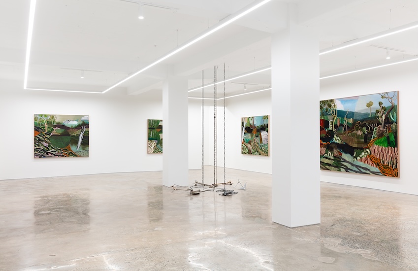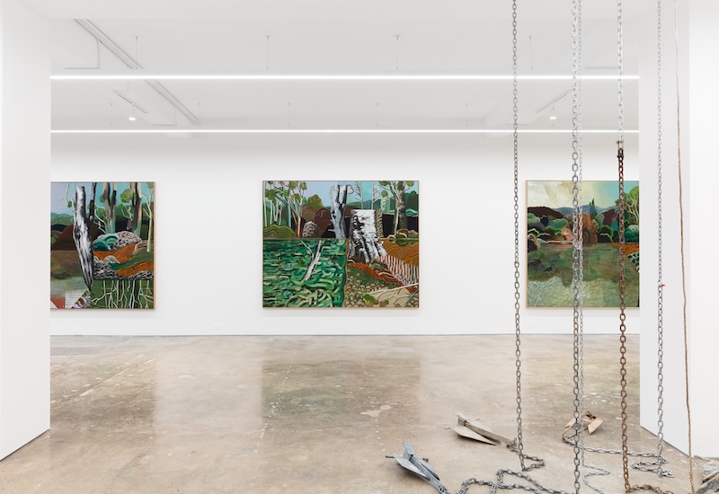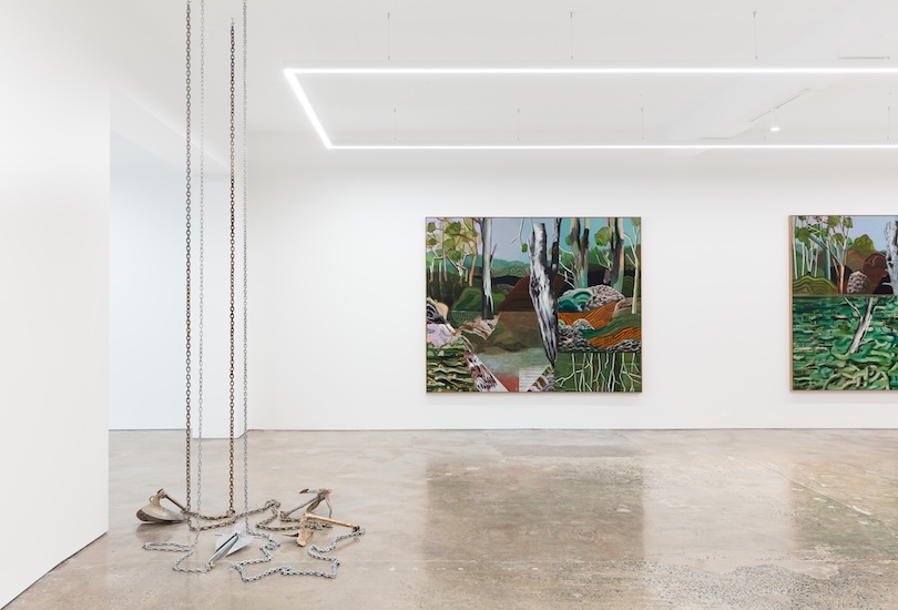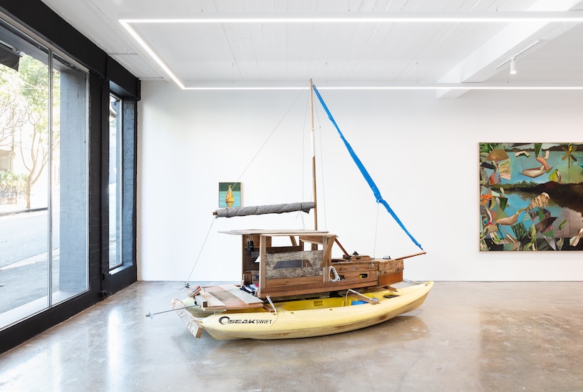 A centrepiece of the exhibition is a vessel made with his son, a raft cobbled together from scavenged material. This vessel anchors the show as a talisman of shared invention and play, echoing the makeshift engineering of both boats and paintings. Canvases unfurl imagined environments that, while rooted in lived experience, are not direct transcriptions. As before, Maestri uses collage to stage compositions in the studio, but this time the source material draws less from global image feeds and more from his immediate world: Pittwater’s mirror-green waters, the Yarra’s muddy tangle of roots, the skeletal silhouettes of habitat trees left standing for parrots to roost.