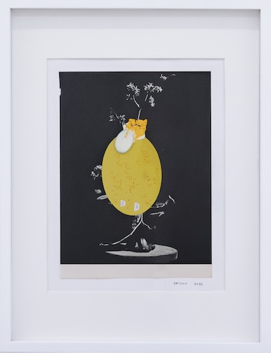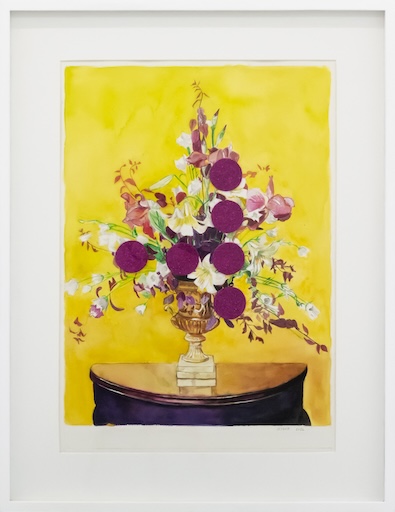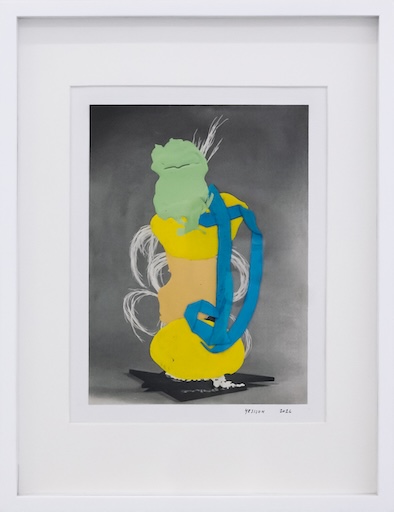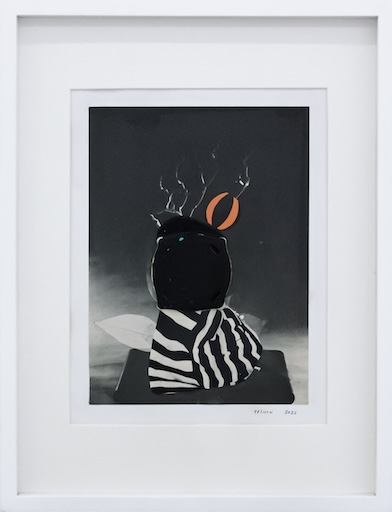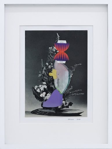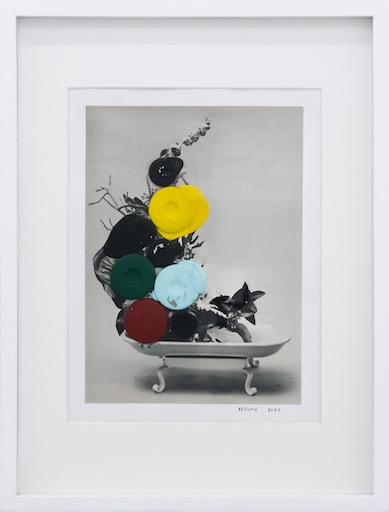 In her collages, she contrasts black-and-white images taken from vintage instructional books for floral arrangement with vivid acrylic swatches of teal, yellow, and red as if subverting the perpetuated ideals that render women palatable. Play and whimsy are evident within these works as pops of colour partially obscure prescribed visions of control. These characteristics that were once considered gamine now become quiet retaliations against strict societal confines.