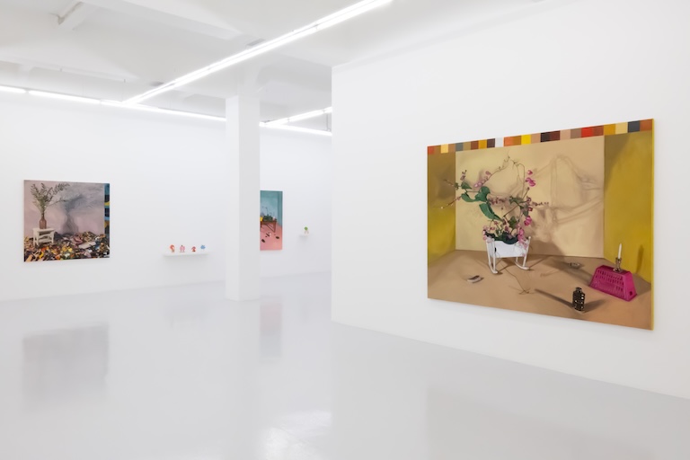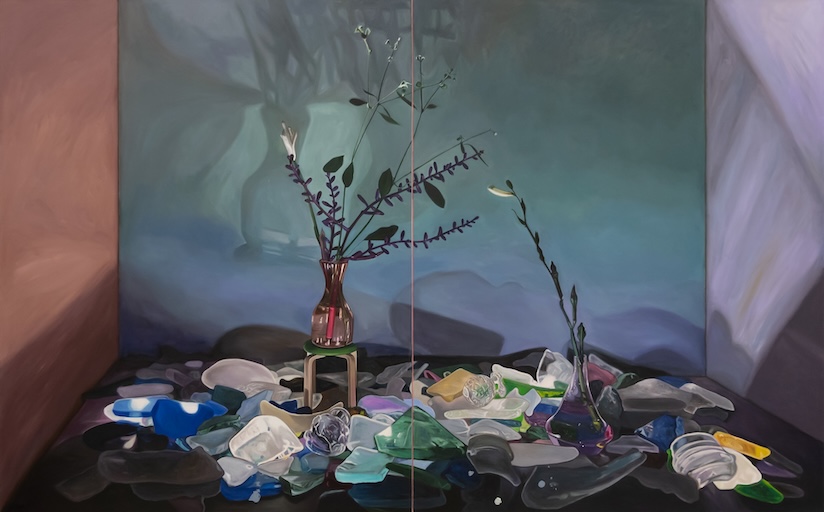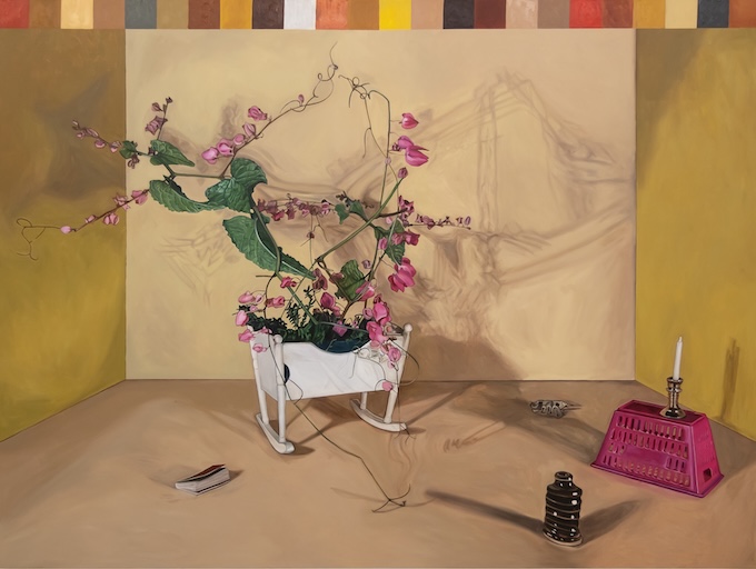 The rendered shadows from all these flowers settle softly onto the blank, windowless walls, creating organic yet haunting patterns in the large canvases. The tension between the flower–an object that grows and wilts–and the inanimate perennial toy miniatures that surround them is not lost on Yasmin Sison. It is in these enclosed spaces that she contemplates a world outside by creating compositions from articles of imposed femininity as they are held abidingly indoors.