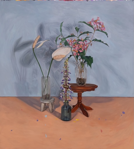 The cadena de amor outgrows the whitewashed cradle it’s perched on. Its tendrils reach out towards pale yellow walls; its bright pink to purple blossoms eagerly search for the sun. Timid lilac lilies on a tiny glass vase face the mosses that overpopulate the varnished table. A trio of white anthurium, purple mayana, and blush-colored banaba prop themselves on glass vessels, directing their faces to the viewer as if to have their photograph taken.