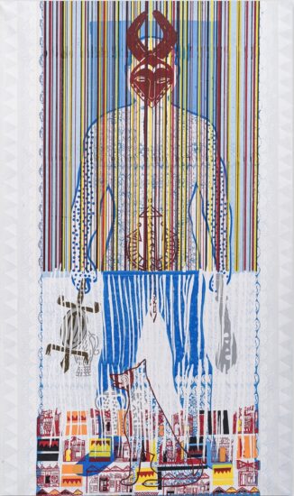 Since the late 1970s, Alberto Pitta has been engaged in the myriad Afrodiasporic cultural traditions of his home region, Bahia, Brazil, especially in Carnival blocos, community-organised parades with distinctive aesthetic practices and spiritual worldviews. Printed and embroidered textiles, as embodied forms of “writing”, communication and storytelling, have grounded the artist’s more than forty-year long career. A researcher, archivist and originator of Afro-Bahian print styles, Pitta thinks of these fabrics as “second skin” that their wearers “transform into free, mobile expressions of culture, and “passports” that allow communities to “navigate the city with pride and purpose”. His work traces the contemporary ancestry of Black Bahia, with dense symbolism drawing from the diverse histories of its people, including the transatlantic slave trade and the mythic universe of West African religions.