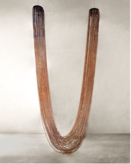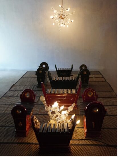 Some wooden rail sleepers are transformed into prayer beads, and others are pulped into paper on which a thousand kinds of physical acts are written out, acts imagined to have been carried out by the rōmusha. These words also act as lyrics for a song played within the gallery space. The gamelan is installed nearby hanging ‘ghost’ figures, dressed in costumes decorated with traces from historic railway constructions.