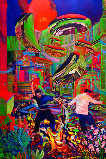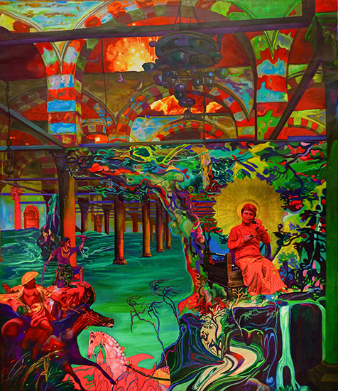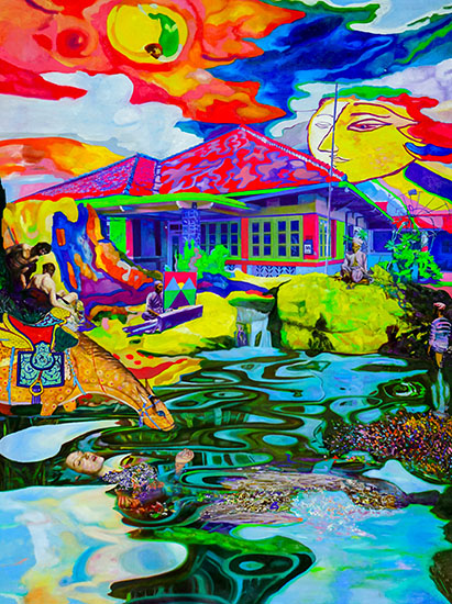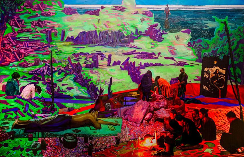 Zico Albaiquni (b. 1987, Indonesia) creates vibrant, complex works that interrogate representations of Indonesia, its colonial past, the Eurocentrism of the art history canon, and his own commodified role as a painter. His work often references the legacy of colonial painting in Indonesia, including Mooi Indie (“beautiful Indies”) painting, which romanticised the landscape and its people under Dutch rule while erasing their struggles. Zico’s saturated colour palette, often dismissed as kampungan (vulgar), is a deliberate reclamation of local aesthetics. His practice treats painting as a site for decolonial thinking, challenging dominant narratives and foregrounding historically marginalised voices and forms. In recent works, he also reflects on his own liminal position as an artist, navigating the legacies of his predecessors and Indonesia’s colonial history.