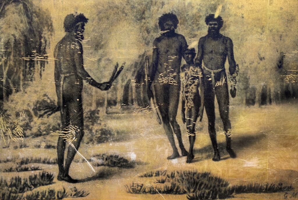 The images in the series sit at a fascinating crossroads of intent, translation, distortion and possibility. Mützel never set foot in Australia; he made illustrations from Blandowski’s sketches and notes. Blandowski, operating within a colonial scientific mission, nevertheless depicted Aboriginal people with a surprising empathy and humanity compared to many contemporaries. Yet, by the time those sketches travelled to Europe, passed through publishers, and landed in the photographic archives of museums, they had become part of the machinery that defined Aboriginal people as ethnographic “types.” I revisit them because they reveal how colonial imagery was constructed — not as a direct encounter but as a chain of translations.