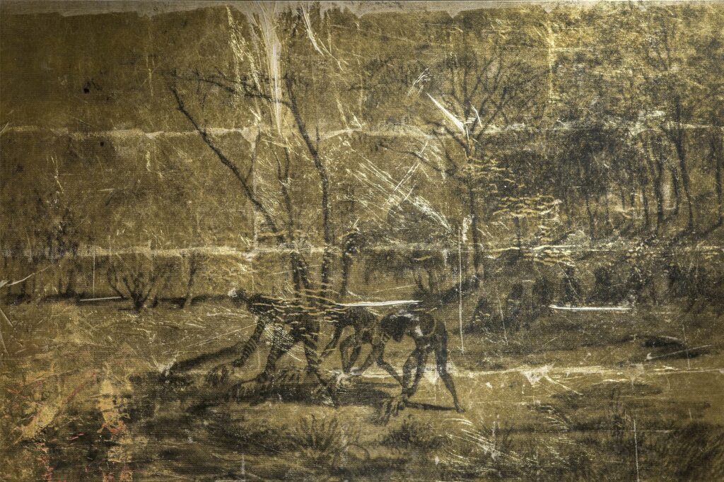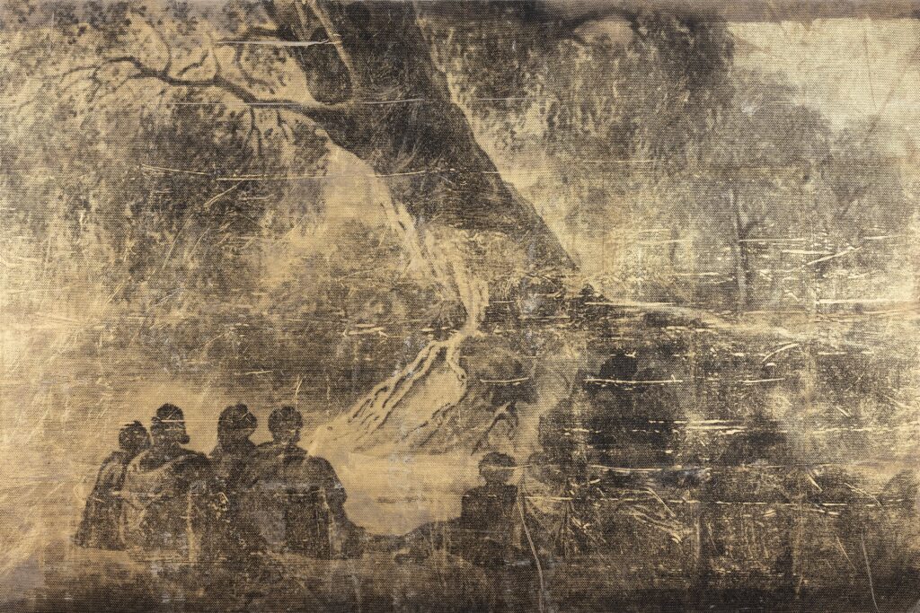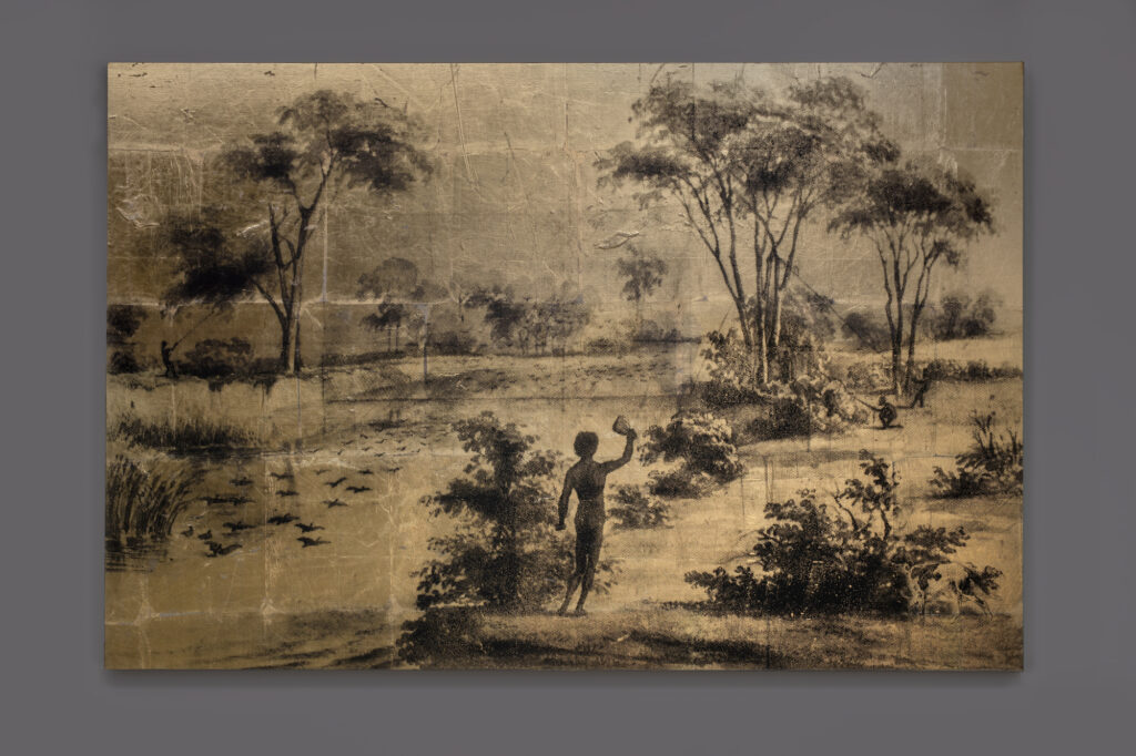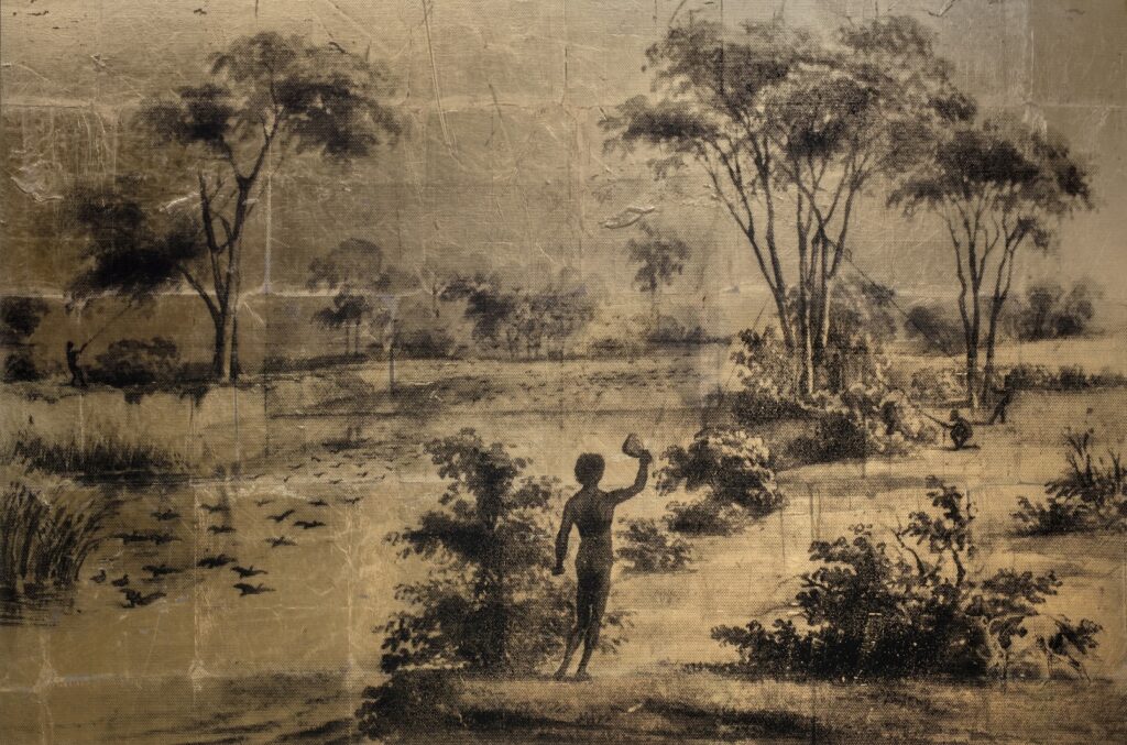 His AUSTRALIA I–VI series (2012–14) emerges from this long-standing and deep archival work. Here, six large-scale works re-present nineteenth-century scenes illustrated by German artist Gustav Mützel, who never visited Australia but translated German naturalist and ethnographic illustrator, William Blandowski’s 1856–57 Murray–Darling Basin sketches into tiny albumen prints. Only a few copies remain in Europe, and the image inspiring AUSTRALIA I survives as a small print in the British Museum.