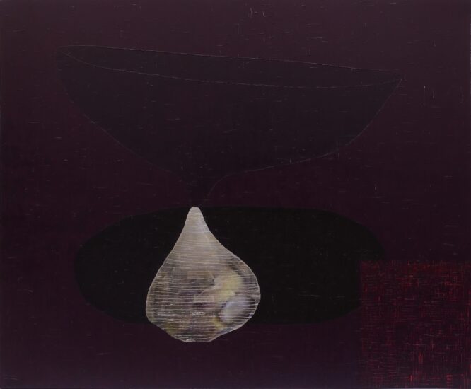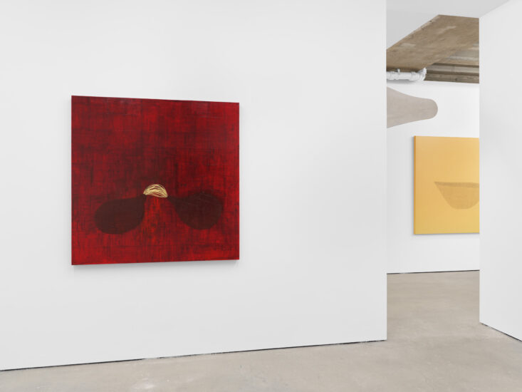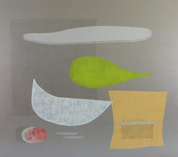 Collage in the artist’s large canvases repeat the notion of gathering, at the level of process. A photograph of fruit/ vegetables taken by the artist sits nestled within a form Sanpitak calls the ‘breast fruit’ in Balancing Cloud, for example; the fruit being a recurring image with which the artist has thought through ideas of birth and origin. In Ancestral Forest, a piece of fabric cut from a garment in her son’s fashion label, Shone Puipia, floats among painted forms. A reflective process drives the work, gathering and layering associations through personal and deep time.