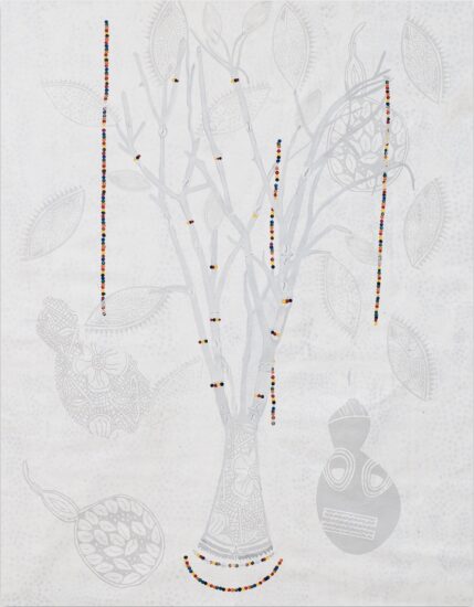 Pitta’s Mariwô series centres the African oil palm tree, considered sacred in Candomblé tradition, the Afro-Brazillian religion in which Pitta’s mother, Ialorixá Mãe Santinha de Oyá, was a spiritual leader. As a ritual object, the palm fronds are shredded and hung on the doors and windows of shrines and ritual spaces, terreiros and casas de santo, as protectors. In the works, the shredded frond is abstracted to become part of the symbolic matrix of the print.