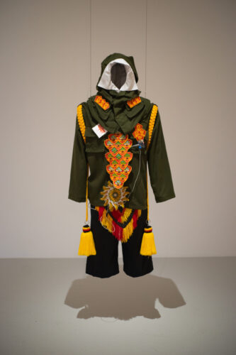 Some wooden rail sleepers are transformed into prayer beads, and others are pulped into paper on which a thousand kinds of physical acts are written out, acts imagined to have been carried out by the rōmusha. These words also act as lyrics for a song played within the gallery space. The gamelan is installed nearby hanging ‘ghost’ figures, dressed in costumes decorated with traces from historic railway constructions.