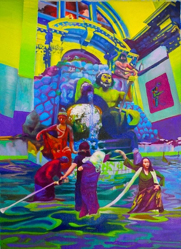 My practice draws from the Indonesian notion of lukis, understood not simply as painting-as-object, but as a situated praxis—a way of making images that is entangled with ritual, labour, spirituality, and everyday life. Painting becomes a method of reading and rewriting: working over surfaces that already carry histories, ideologies, and desires. Images are borrowed, overlaid, obscured, and disturbed, allowing contradictions to remain visible rather than resolved. It is shaped by my physical journey between Bandung, Ciamis, and now Melbourne; between studio, archive, ritual site, and domestic space. Lukis is inseparable from my family history, from stories inherited through my parents, from moments of return to ancestral land, and from the slow realisation that the personal is never outside the political. Even belief—often treated as private—carries historical weight.
